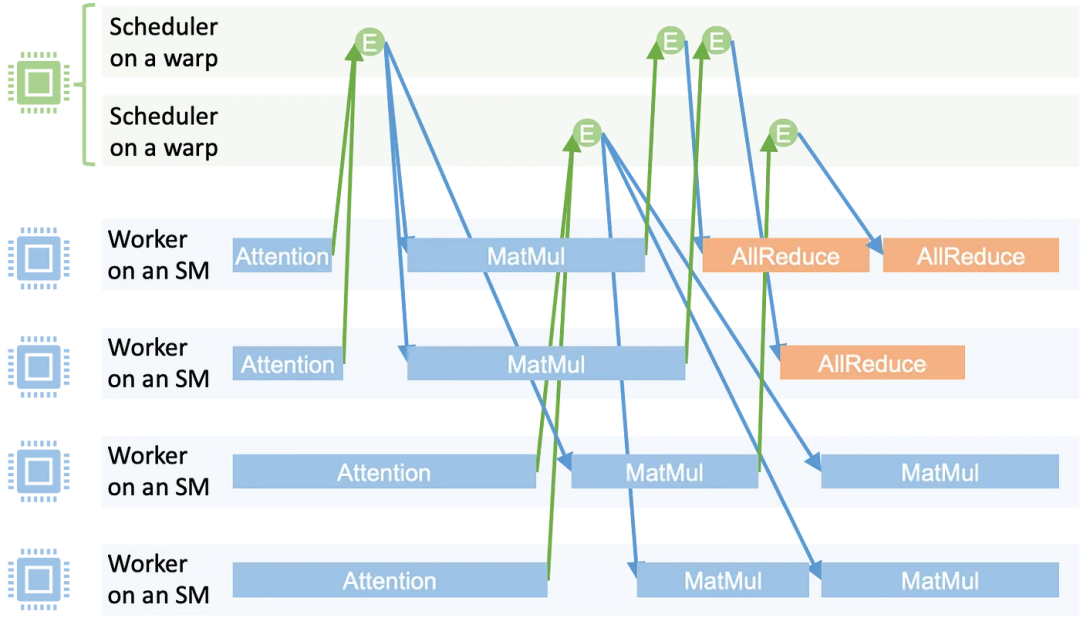 事件触发:任务完成后通知触发事件。系统仅启动一个 GPU 内核来执行整个模型 —— 从逐层计算到 GPU 间通信 —— 整个过程无需中断。并维护专属任务队列。导致跨层流水线优化机会受限。