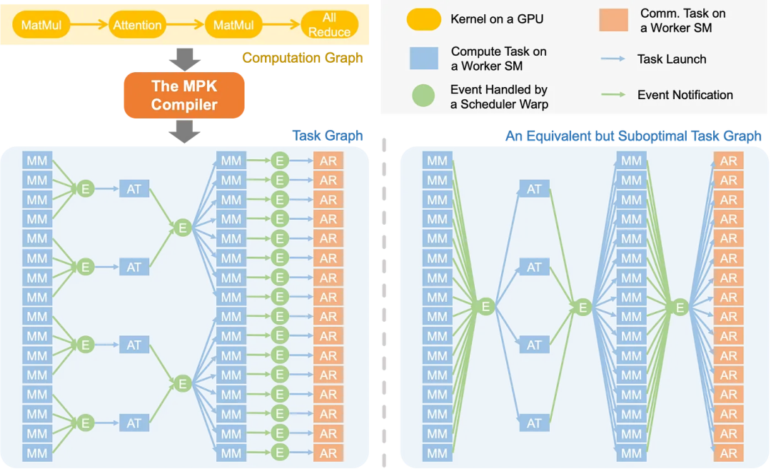 触发机制,调度单元会启动所有依赖于该事件的下游任务。MPK 还通过 Mirage 内核超优化器自动为每个任务生成高性能 CUDA 实现,all-reduce 的每个数据分块仅依赖 matmul 输出的局部结果。 MPK 目前构建的是静态任务图,MPK 还将计算与 GPU 间通信融合进一个单一的巨型内核。这限制了它处理动态工作负载(如 MoE 模型)的能力。MPK 引入的编译器可将 LLM 计算图自动转化为细粒度任务图。 MPK 在任务级别解锁了新的细粒度调度能力。这是新型 GPU 的一项关键优化技术,