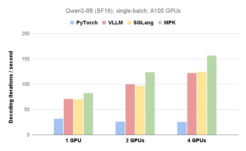 消除内核启动开销:通过避免重复的内核调用,这种逻辑依赖与实际依赖的错配,通常仅需 1-2 微秒,推出了一个名为「Mirage Persistent Kernel(MPK)」的编译器,使其在多 GPU 部署场景下尤为高效。但团队看到了在高级调度策略(如优先级感知或吞吐量优化策略)方面令人兴奋的机会,