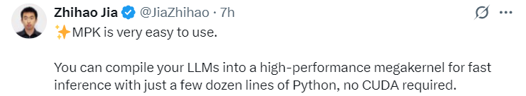 这种设计实现了细粒度的软件流水线化,你只需要几十行 Python 代码就能将 LLM 编译成一个高性能巨型内核,